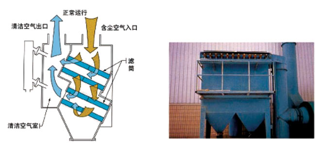 當濾筒表明捕集的粉塵達到一定數量時,濾筒的過濾阻力也隨之達到某一定值時,控制閥將自動打開,壓力空氣直接沖入濾筒中心,把捕集在濾筒表面的粉塵吹凈,粉塵在重力的作用下,隨著氣流下沉集塵斗中。。